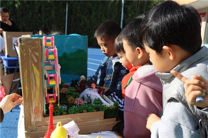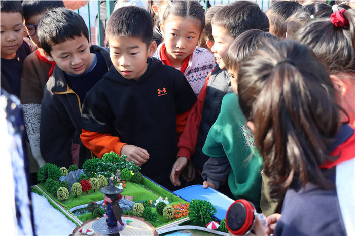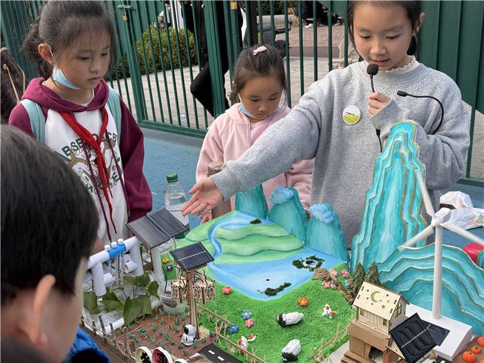 “快来看看!高效节能、超级环保的未来农舍。”不远处的天和园校区,三年级15班的王嘉薇正在介绍的展品引人驻足。雪弗板制作的山川连绵起伏,石膏塑形的山谷由丙烯颜料染上盈盈青绿,朵朵黏土小花点缀在绿水青山间。另一边,装有太阳能板、风力发电机的小屋科技范儿十足,配合雨水收集水循环系统、自动灌溉系统,规划出片片整齐的乡村田野。“各个板块由传感器连接,形成一个智能整体,农舍变智能了,农民伯伯也就不那么辛苦了。”组员吕行说。